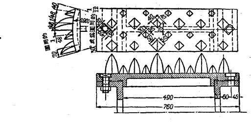 雙齒輥式破碎機的工作及其破碎的準確度與牙齒及破碎面的材料的質(zhì)量有關(guān)。平常在齒輥破碎機的輥上裝有由鋼板制成的牙床,此牙床分為數(shù)片,用螺栓固定在輥的外緣上。如圖所示。牙床板是用錳鋼鑄成的。在國外的機器制造廠中,雙齒輥式破碎機采取這種形式的碎破面對于工作是極方便的,因為,在更換已經(jīng)損壞的牙板時,不至于浪費更多的時間。