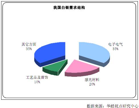 我國國內(nèi)白銀的主要消費領(lǐng)域及消費結(jié)構(gòu)大致為:電子電氣35%、感光材料20%、工藝品及首飾10%、其它方面15%。